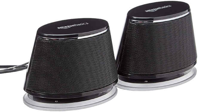 • Amazon Basics USB Plug-n-Play Computer Speakers for PC or Laptop – 1 Pair (2 Speakers), Black with Blue LED Light